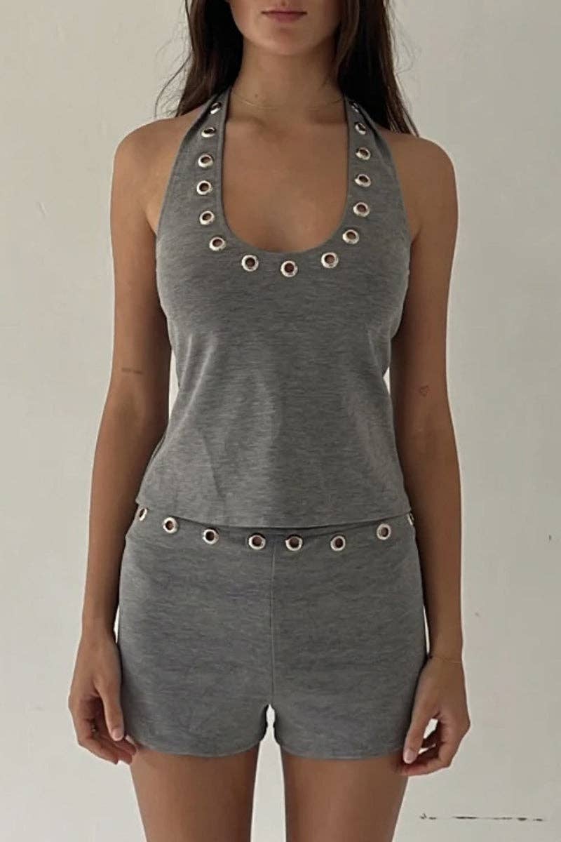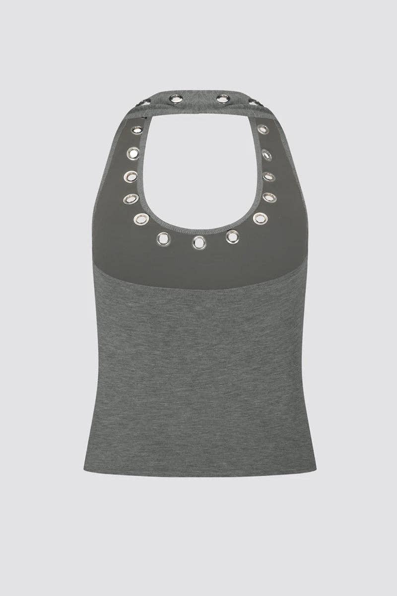 Your edgy tank top features grommet eyelet details around the neckline. Racerback design adds a sporty touch. Great for casual and summer styling.
