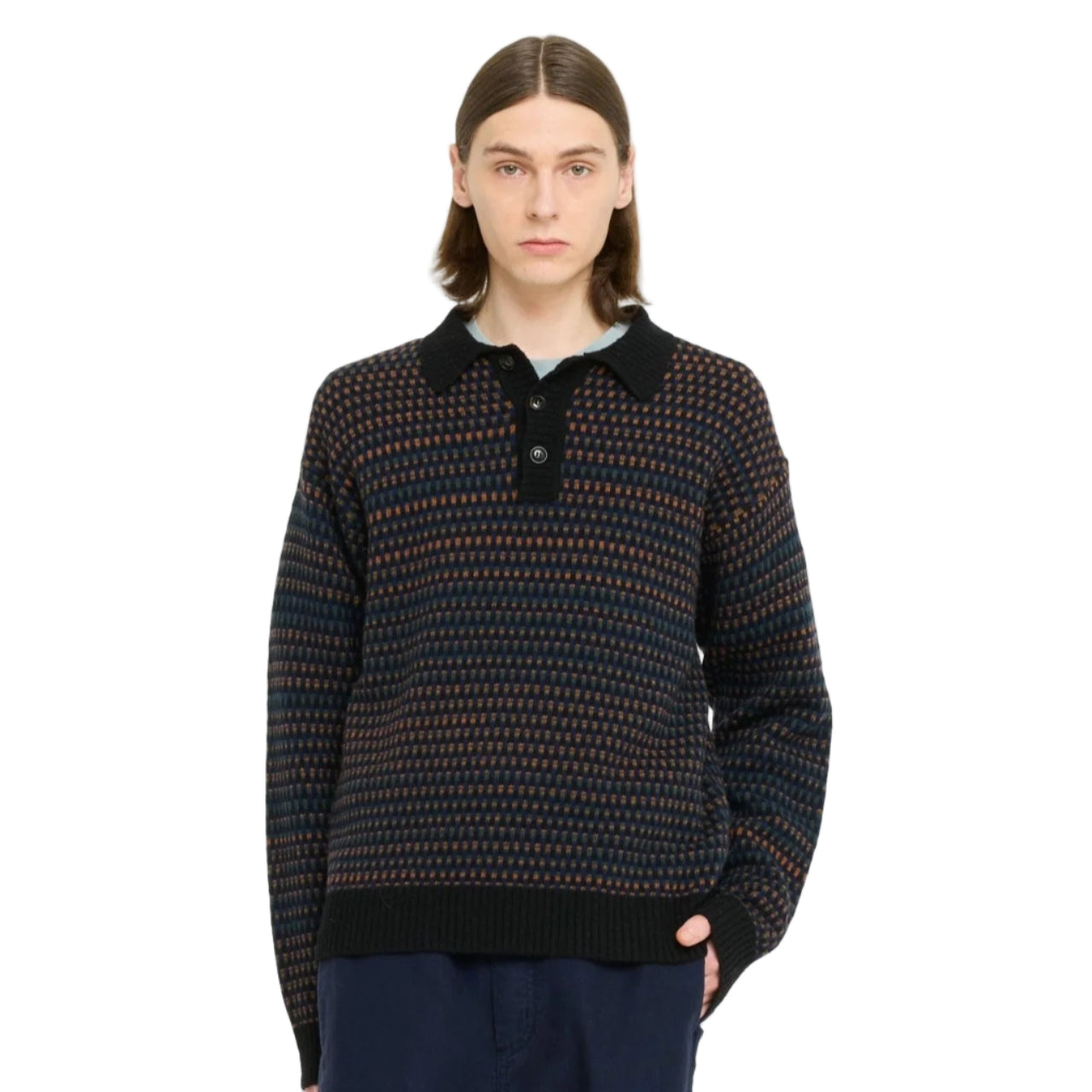 The Meryon Knit features a textured pattern with a polo-style design. A contrast collar and buttoned placket add detail to this comfortable, standout piece.